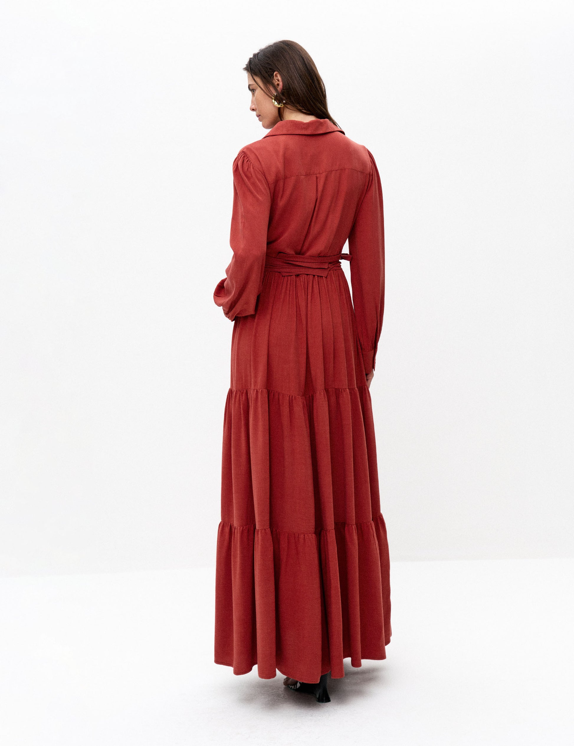 Robe élégante en viscose fluide, dotée de manches longues qui épousent délicatement la silhouette. La pièce est complétée par une ceinture assortie du même tissu, permettant d'ajuster la taille et de créer une définition subtile. La viscose offre une drapabilité exceptionnelle et un confort optimal pour une allure raffinée et intemporelle.